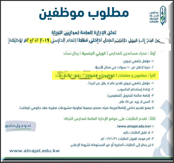 إعلان مطلوب معلمين ومعلمات للعمل بمدارس النجاة الاهلية بدولة الكويت وظائف فى الكويت اعلانات وظائف في الكويت