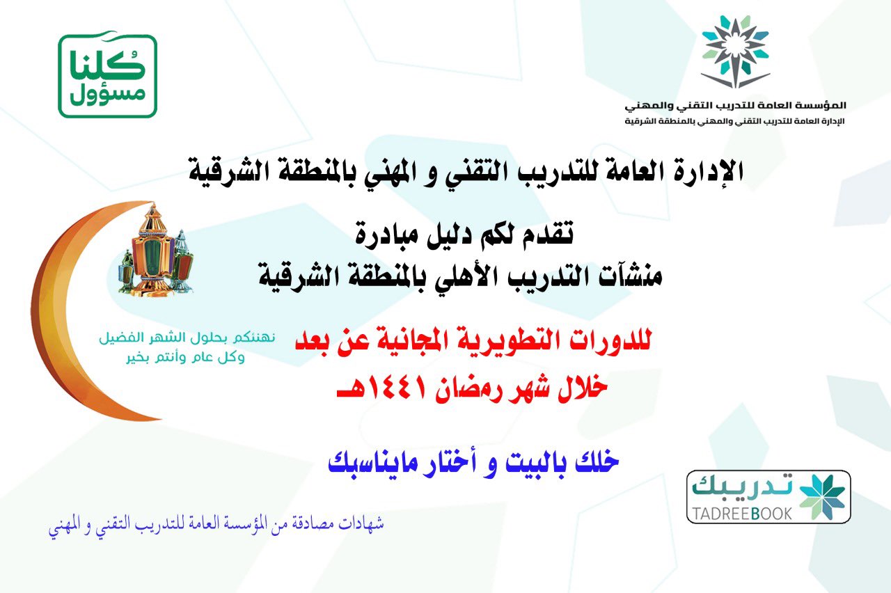 التدريب التقني بالمنطقة الشرقية On Twitter كلنا مسؤول دورات تطويرية مجانية عن بعد عبر مبادرة منشآت التدريب الأهلي في المنطقة الشرقية خلال شهر رمضان المبارك خلك بالبيت وحدد ما يناسبك
