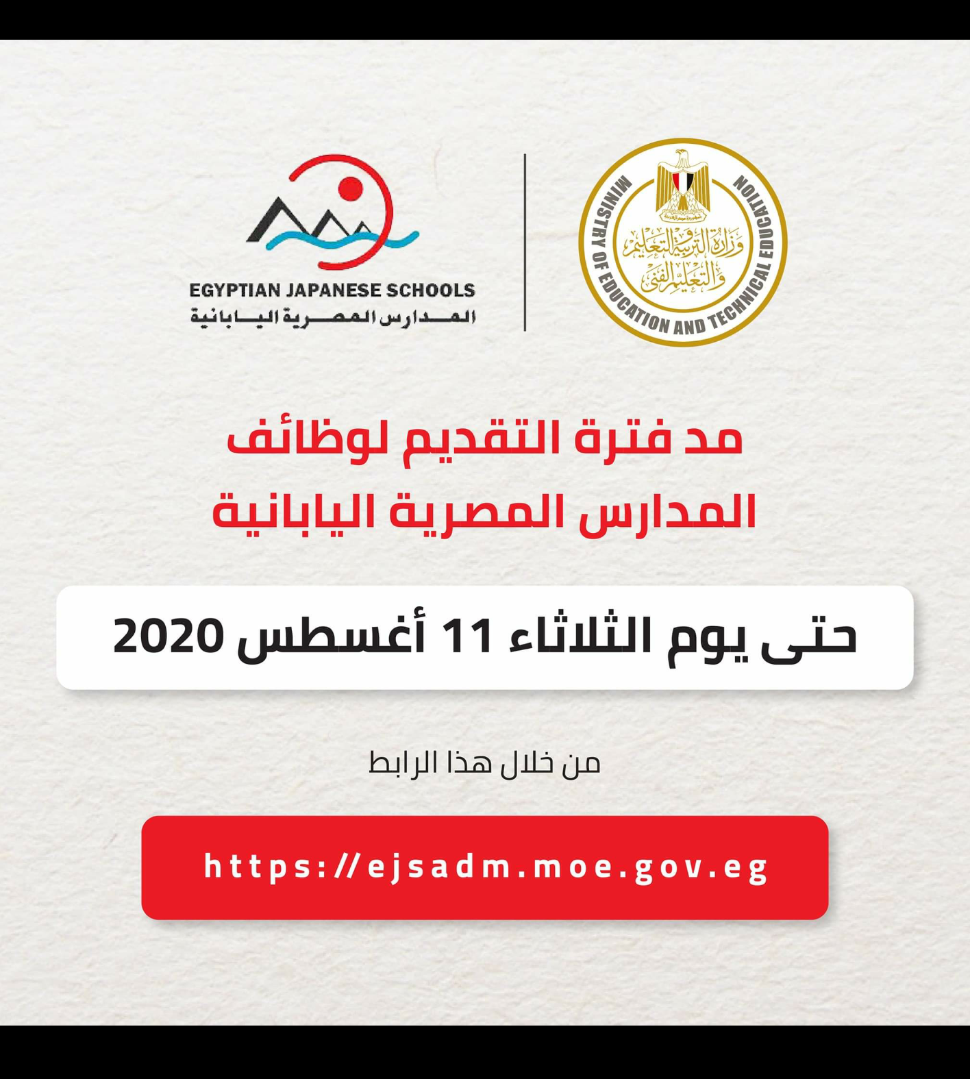 وزارة التربية والتعليم المصرية مد التقديم بوظائف المدارس المصرية اليابانية حتى ١١ أغسطس ٢٠٢٠ تعلن وزارة التربية والتعليم عن مد باب التقديم للعمل بالمدارس المصرية اليابانية للعام الدراسي ٢٠٢٠ ٢٠٢١ حتى يوم