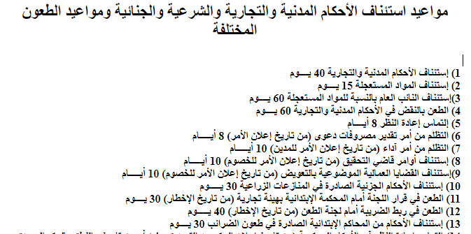 معلومات المحامي مواعيد استئناف الأحكام المدنية والتجارية والشرعية والجنائية ومواعيد الطعون المختلفة