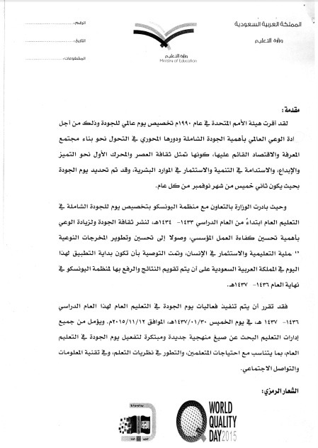 وحدة الجودة الشاملة وقياس الأداءبخميس مشيط انطلاق يوم الجودة العالمي يوم الجودة في التعليم العام لعام 1434 1435